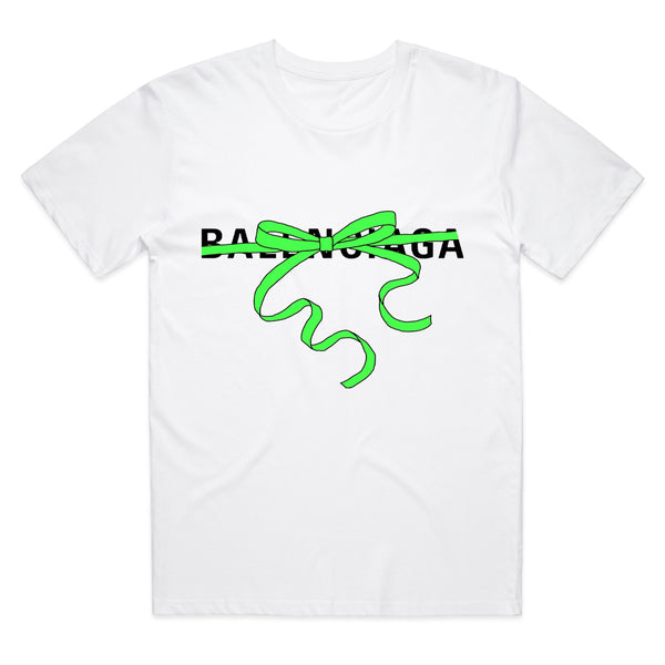 The BLAH-LENCIAGA BOW T-shirt features a bold black logo accented with a neon green ribbon detail, delivering a clean, contemporary graphic statement.